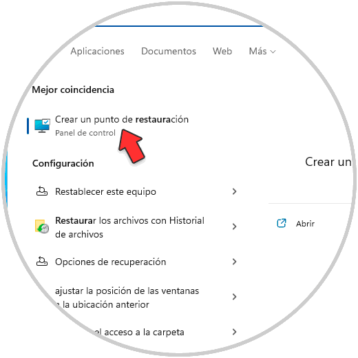 En el buscador ingresamos "restaurar" y seleccionamos "Crear un punto de restauración":