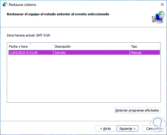 Damos clic en "Restaurar sistema" para abrir el asistente: