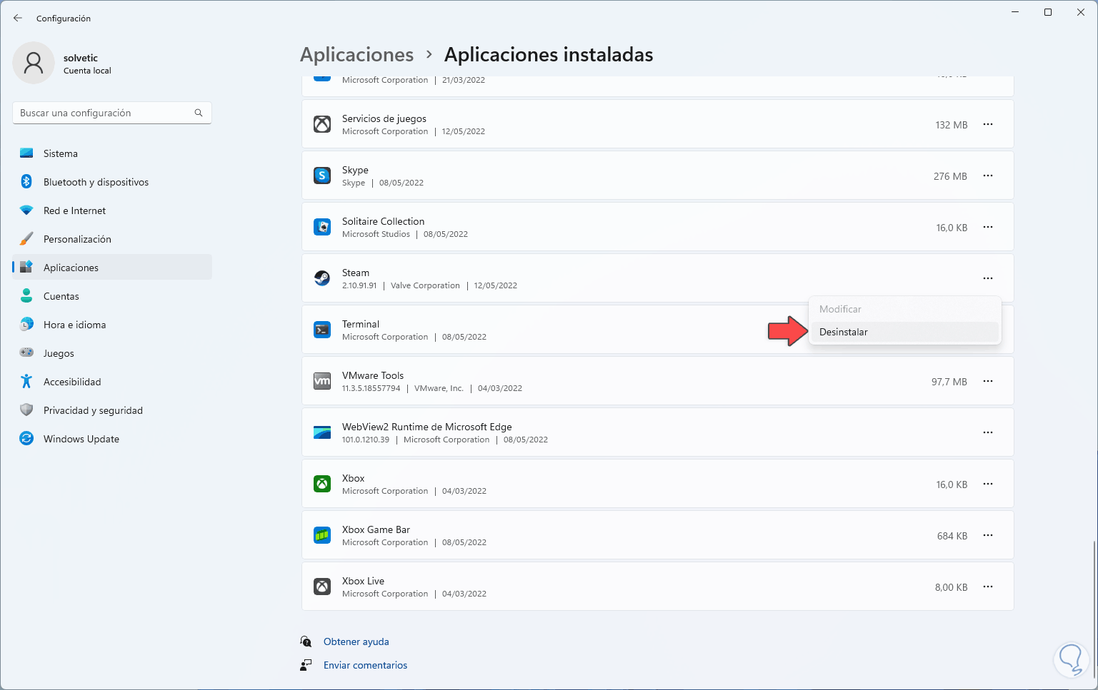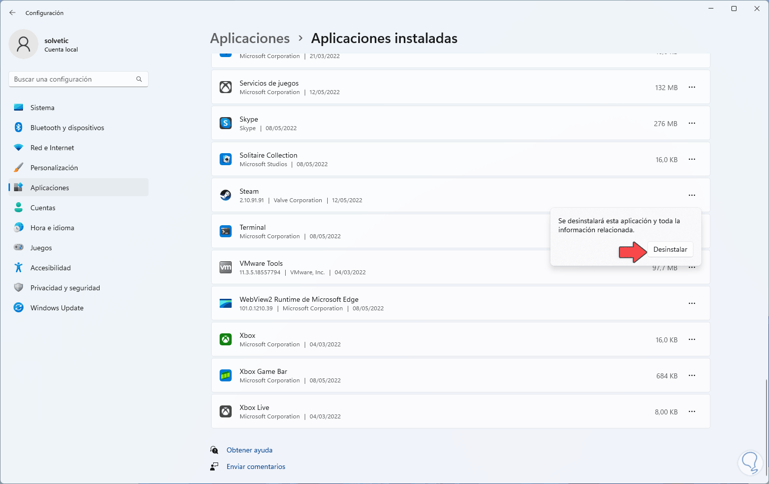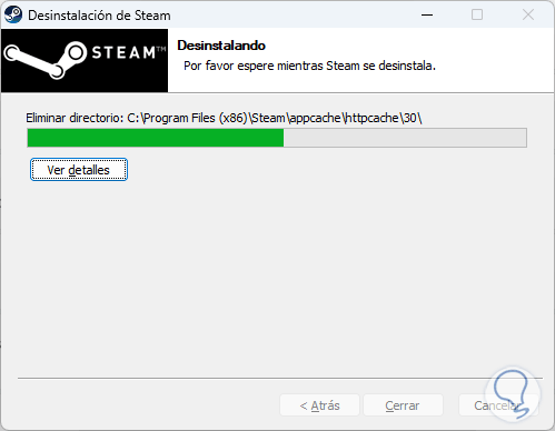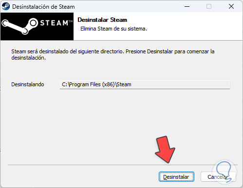 Damos clic en “Desinstalar” y se dará paso a la desinstalación de Steam en Windows 11:
