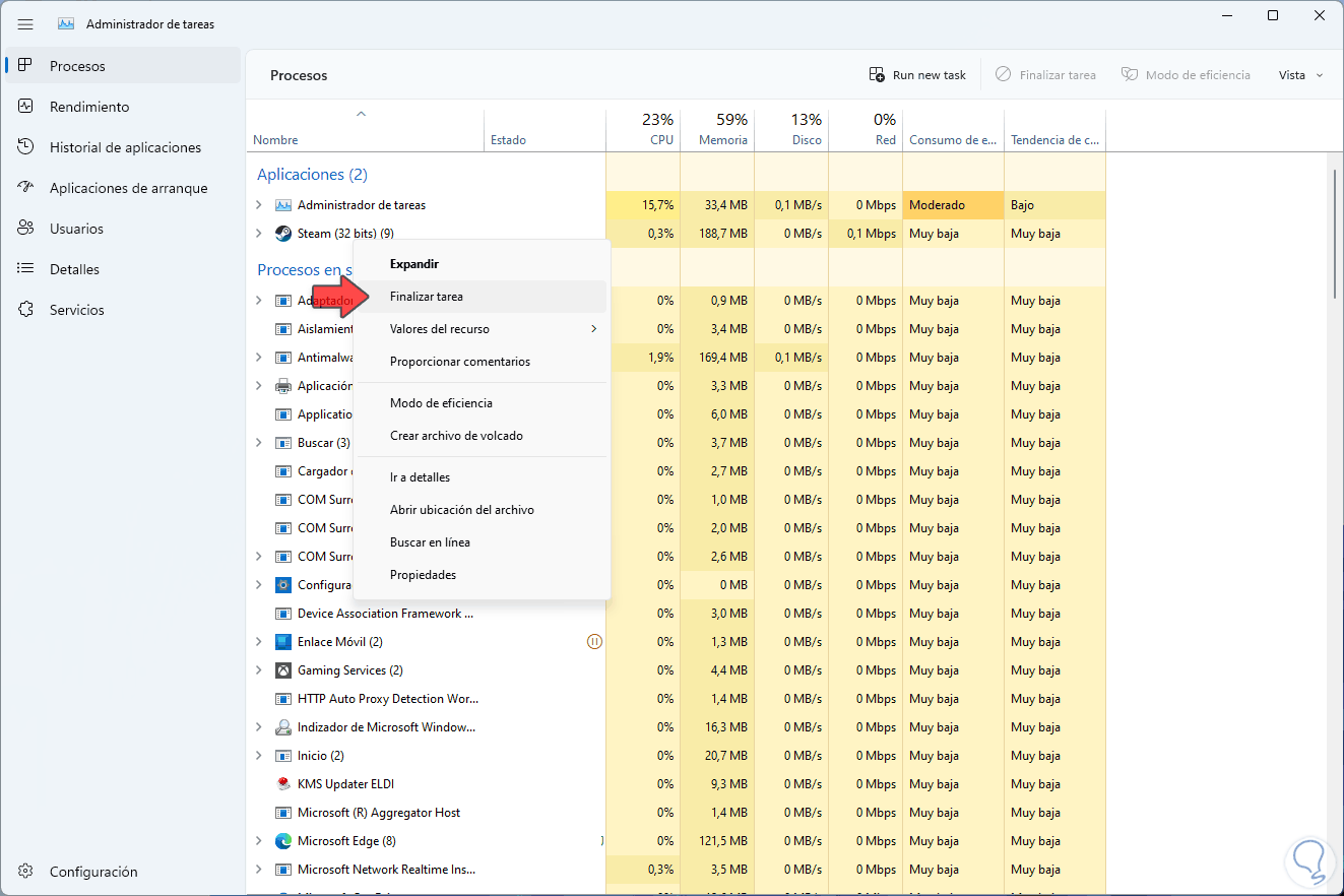 En el Administrador damos clic derecho sobre Steam y seleccionamos la opción "Finalizar tarea":