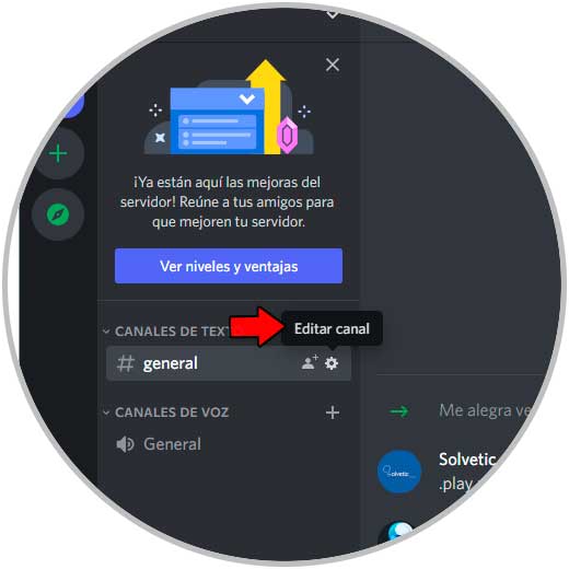 Para esto abrimos Discord, seleccionamos el servidor, luego pasamos el mouse sobre el canal y damos clic en "Editar canal":
