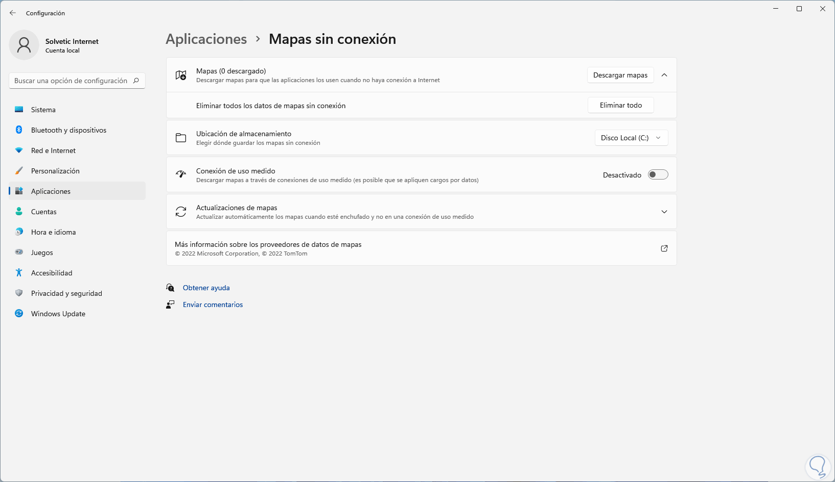 Existen ciertas opciones que podemos editar en los mapas sin conexión en Windows 11, para ello vamos a "Mapas sin conexión":