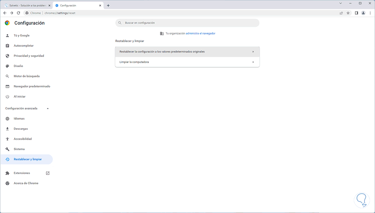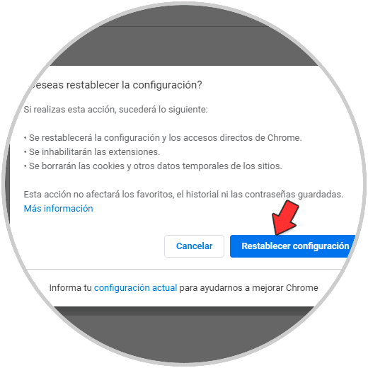 Damos clic en "Restablecer configuración" y es de anotar que esto borrara contraseñas, marcadores y extensiones por lo cual Solvetic te recomienda crear una copia antes de ejecutar esta operación: