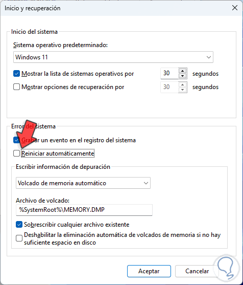 En este caso desactivamos la casilla "Reiniciar automáticamente". Aplicamos los cambios.