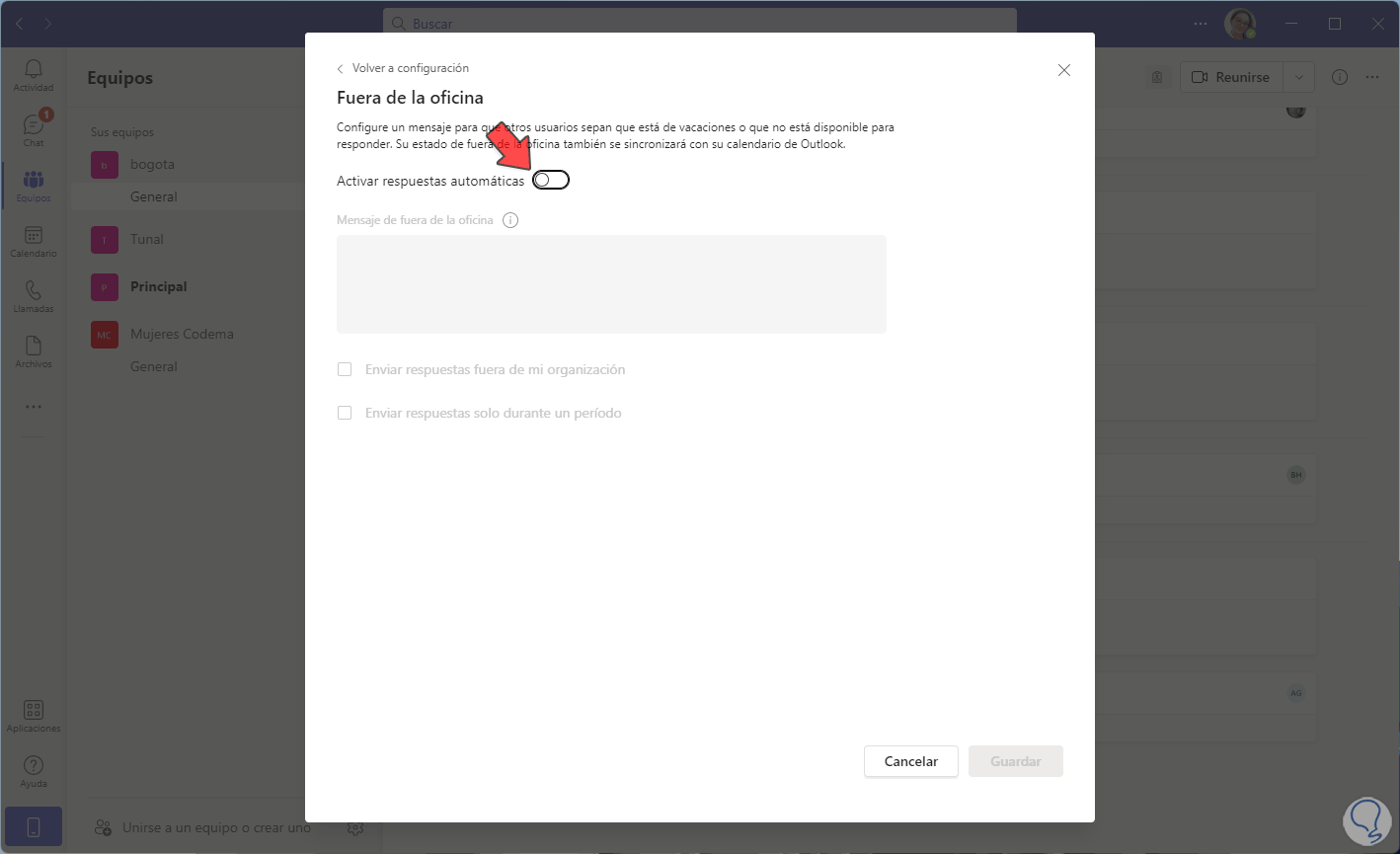 Vamos a ver lo siguiente. Activamos el interruptor "Fuera de la oficina" e ingresamos el mensaje deseado