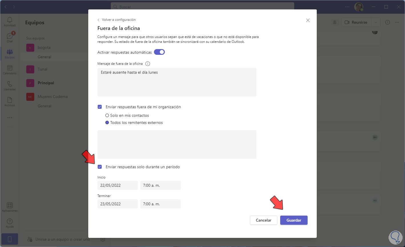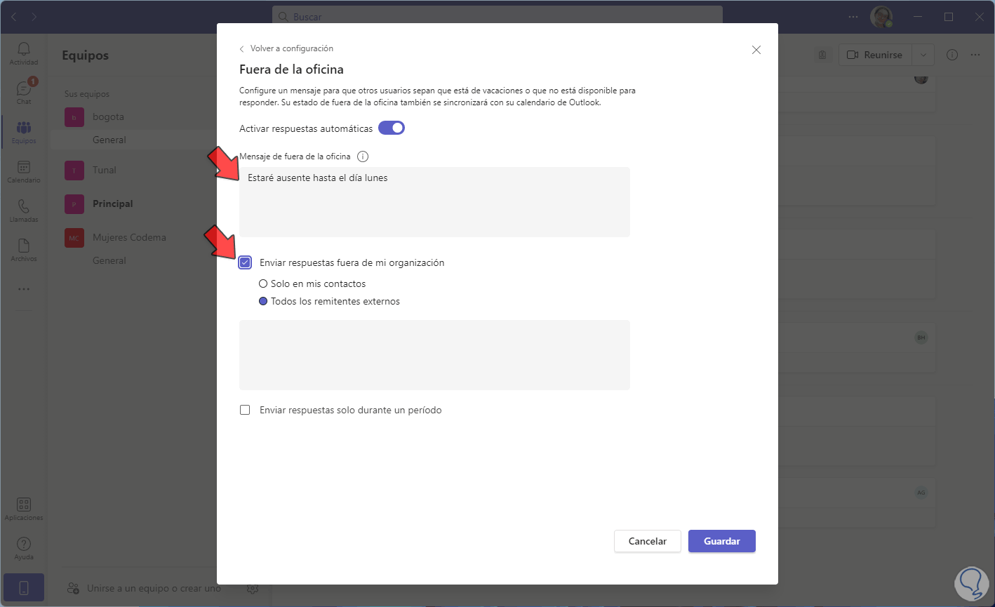 , luego activamos la casilla "Enviar respuestas fuera de mi organización" y definimos a quién enviar las respuestas de Fuera de oficina: