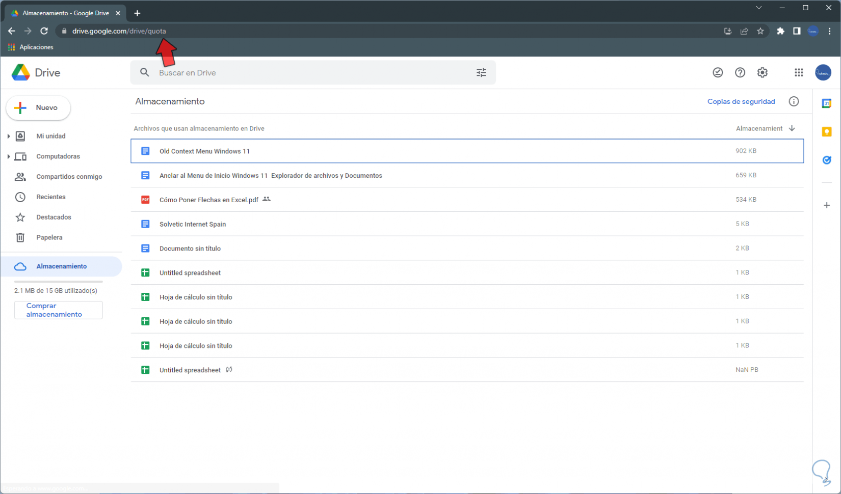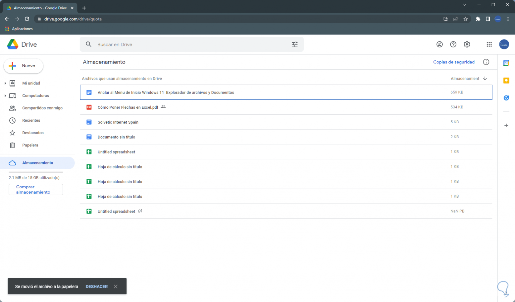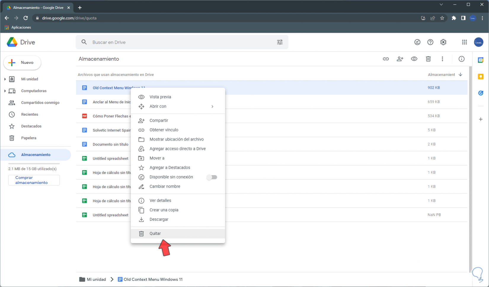 Esto mostrará el contenido de Google Drive con la columna “Almacenamiento” donde veremos el tamaño de cada archivo, damos clic derecho sobre los archivos pesados, y que no son útiles, y seleccionamos "Quitar":
