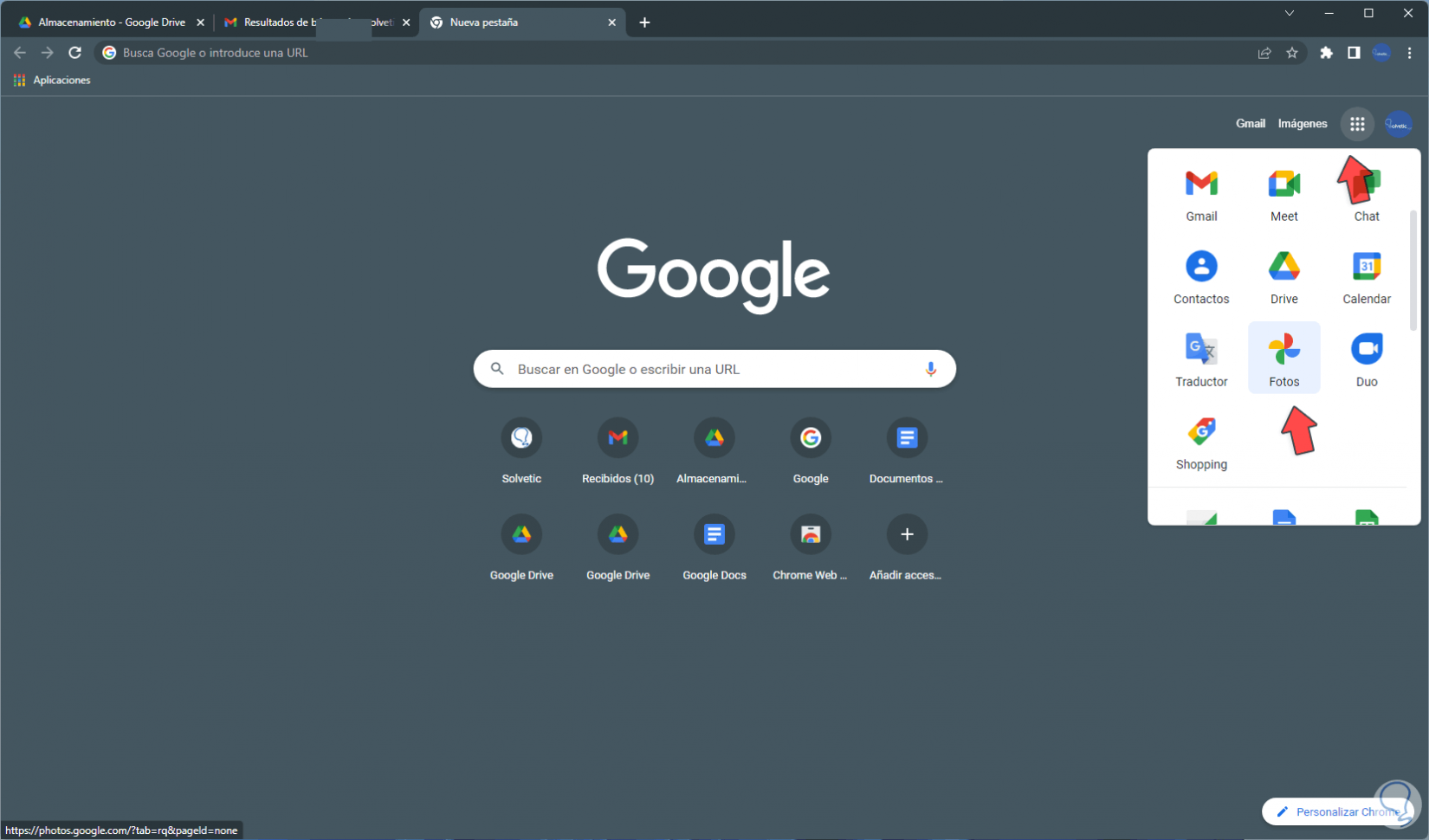 Ahora es momento de liberar espacio en Fotos la cual es una de las que mas espacio consume debido al tamaño de las fotos, para ello abrimos una nueva pestaña y en "Aplicaciones de Google" damos clic en "Fotos":