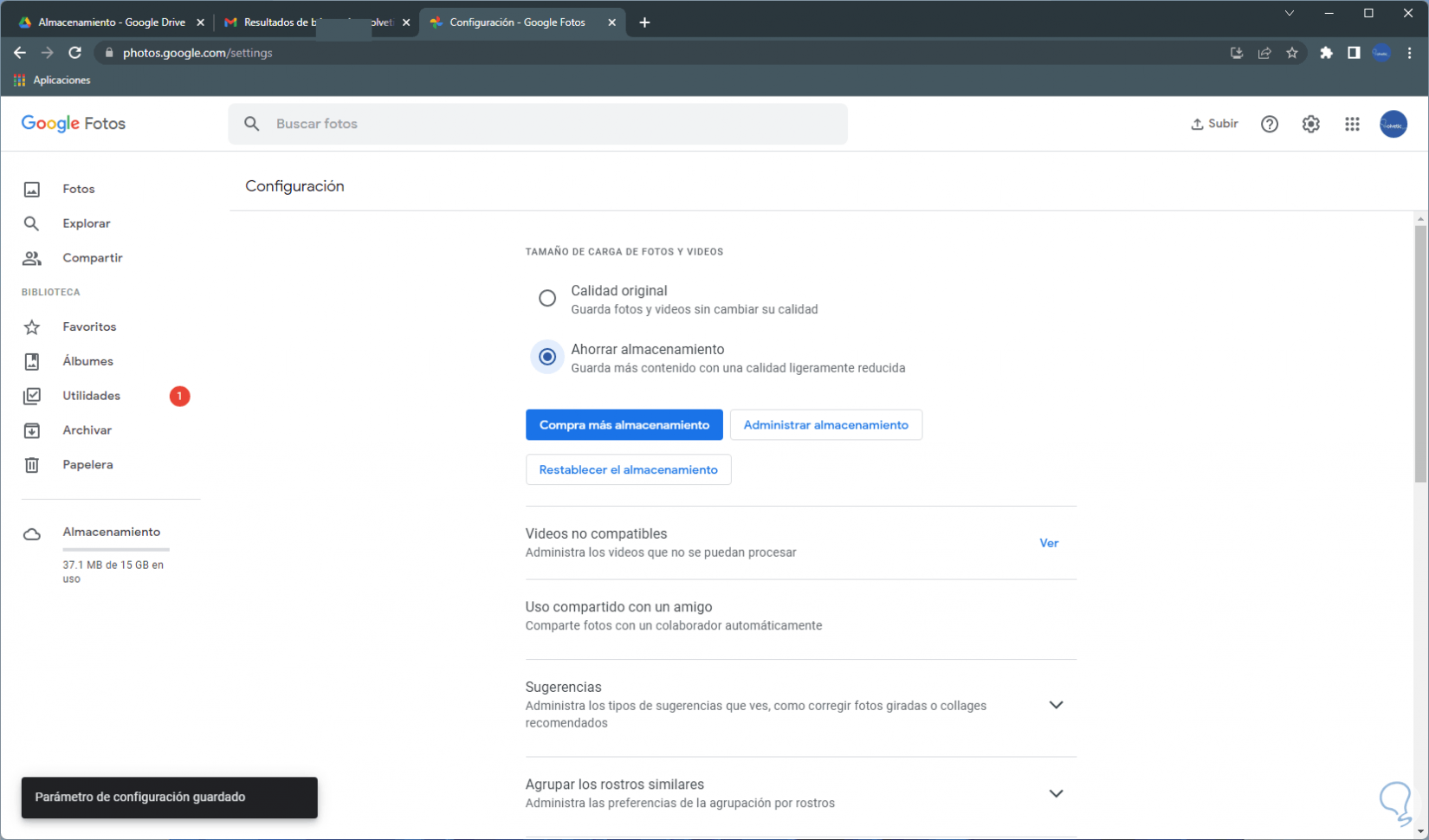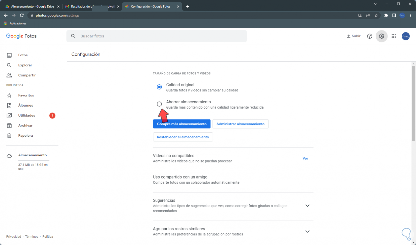 Como vemos por defecto esta activa la opción de Calidad original la cual puede hacer que las fotos pesen demasiado en base a las dimensiones del medio desde el cual fueron tomadas, para reducir esto, activamos la casilla "Ahorrar almacenamiento":