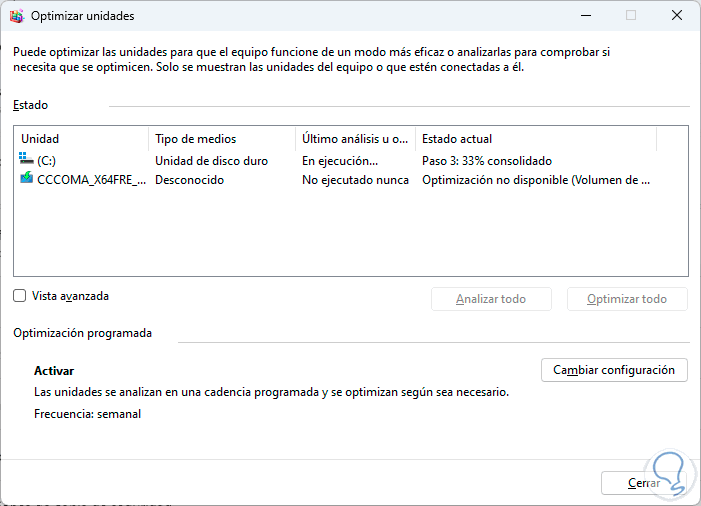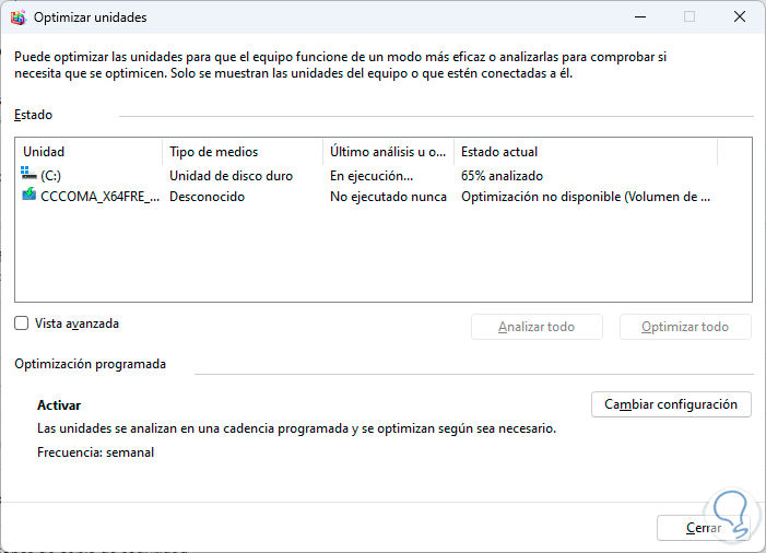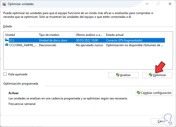 Damos clic en "Optimización de unidad" para ver la siguiente ventana emergente: