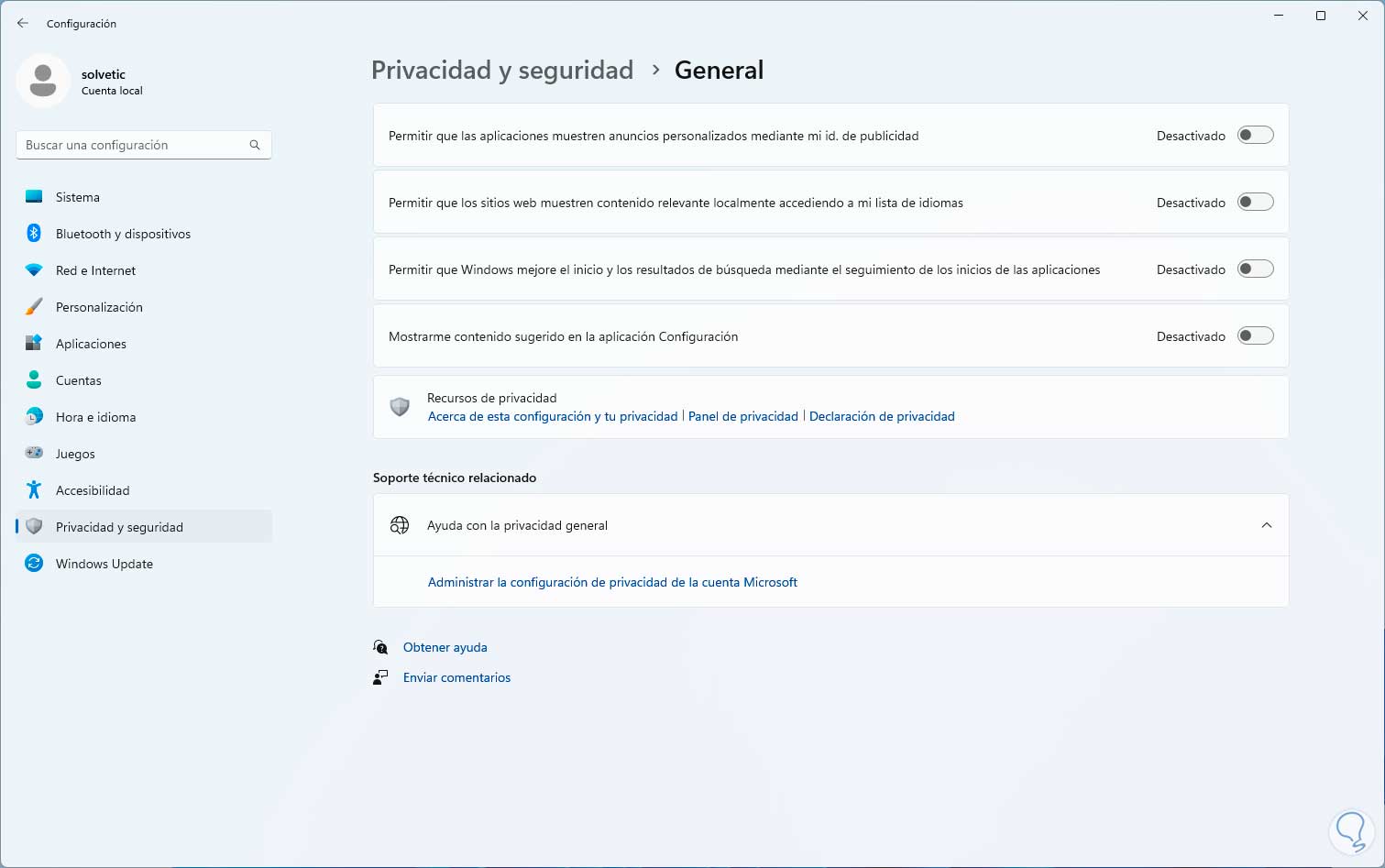Estas son opciones para que el sistema use nuestros datos lo cual a la final tendrá un impacto negativo en el rendimiento, desactivamos los interruptores disponibles: