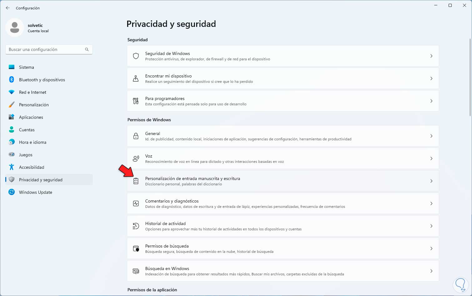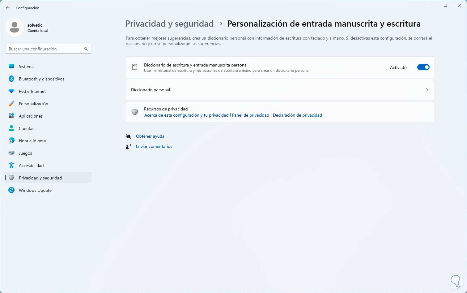 Finalmente seleccionamos "Personalización de entrada manuscrita y escritura":