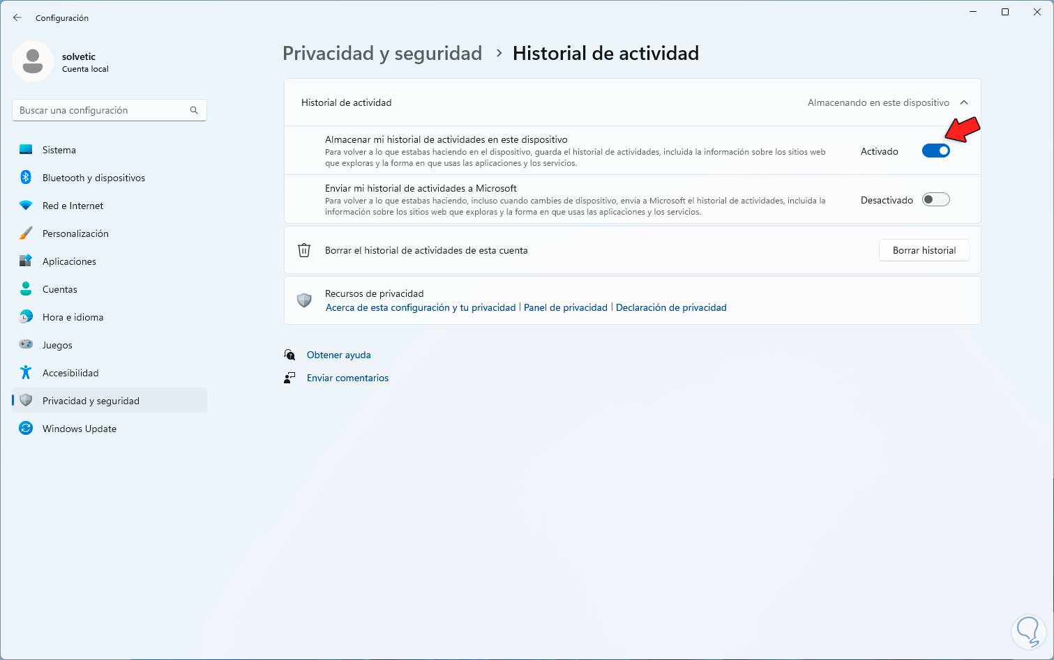 Desactivamos el interruptor "Almacenar mi historial de actividad en este dispositivo":
