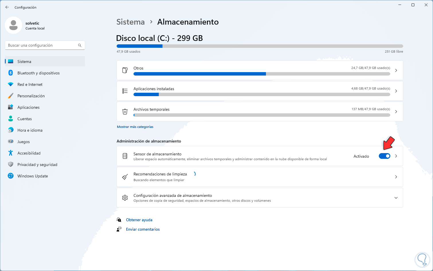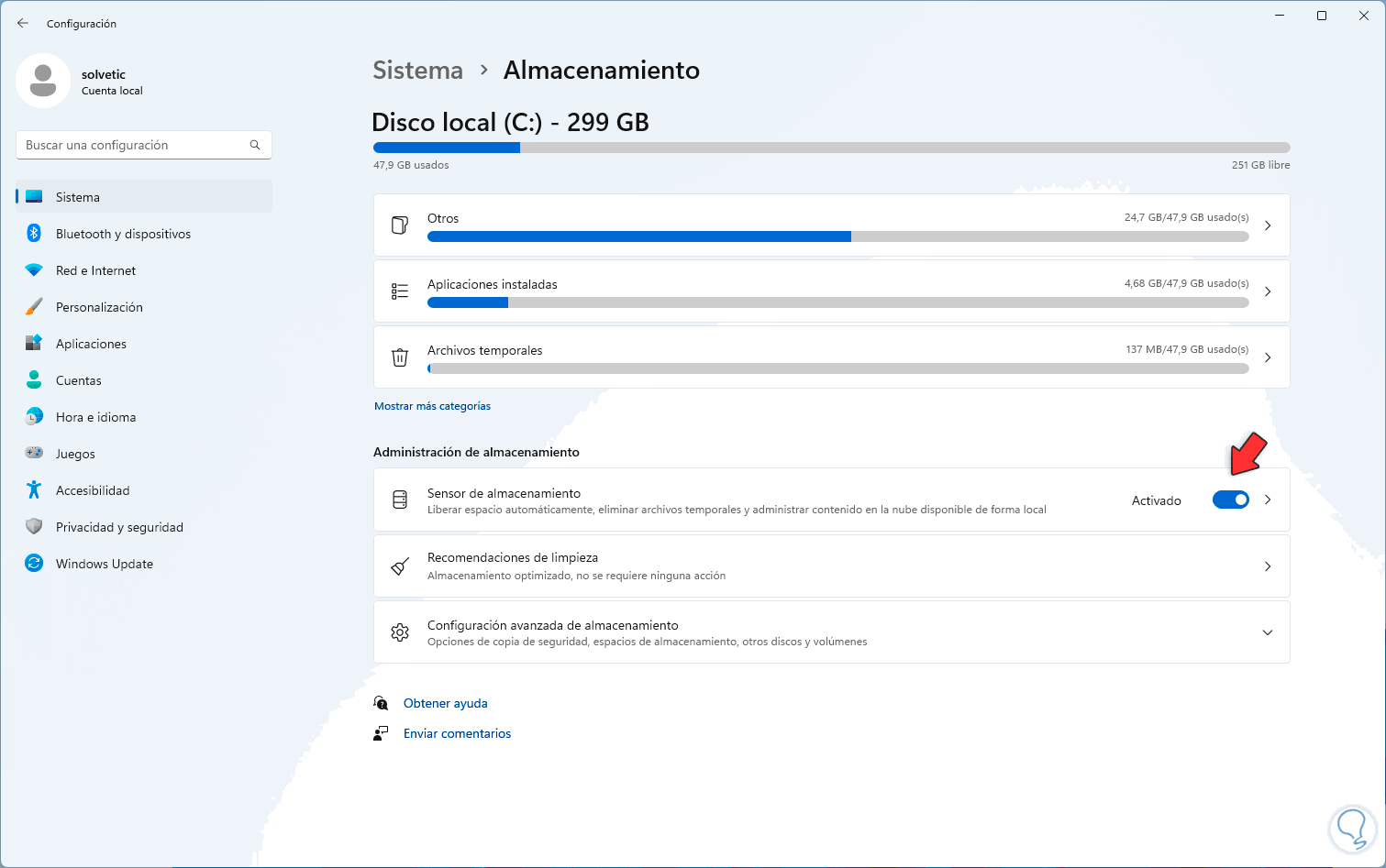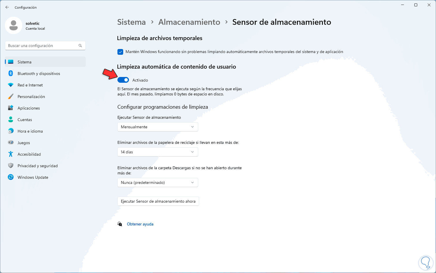 Debemos confirmar que el interruptor “Sensor de almacenamiento” este activo, ahora damos clic en "Archivos temporales" para ver la estructura de esta punto crítico en Windows 11: