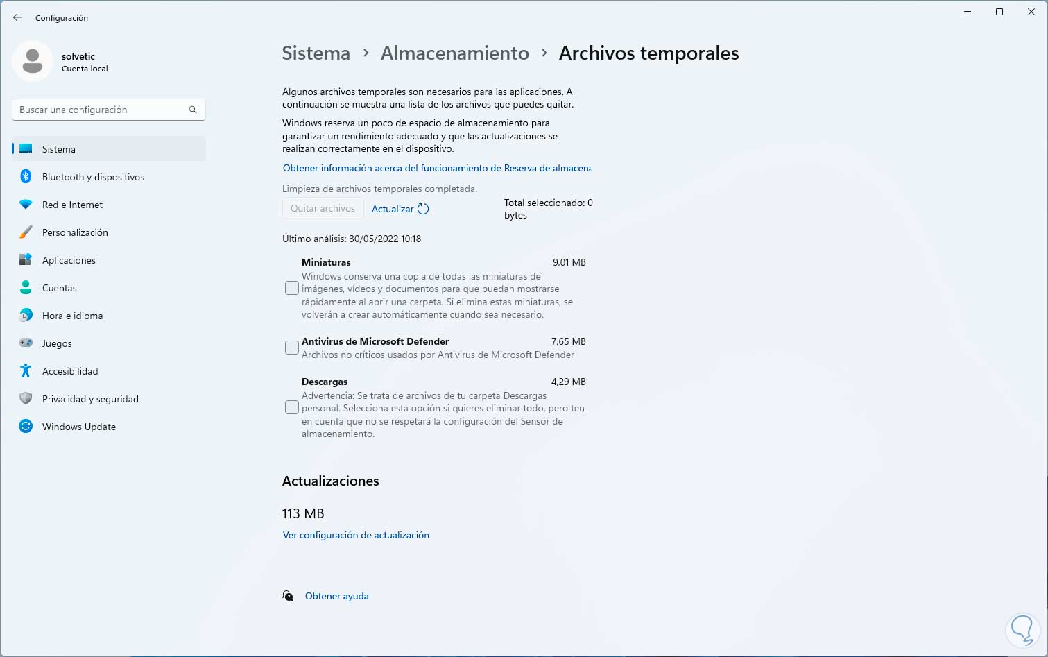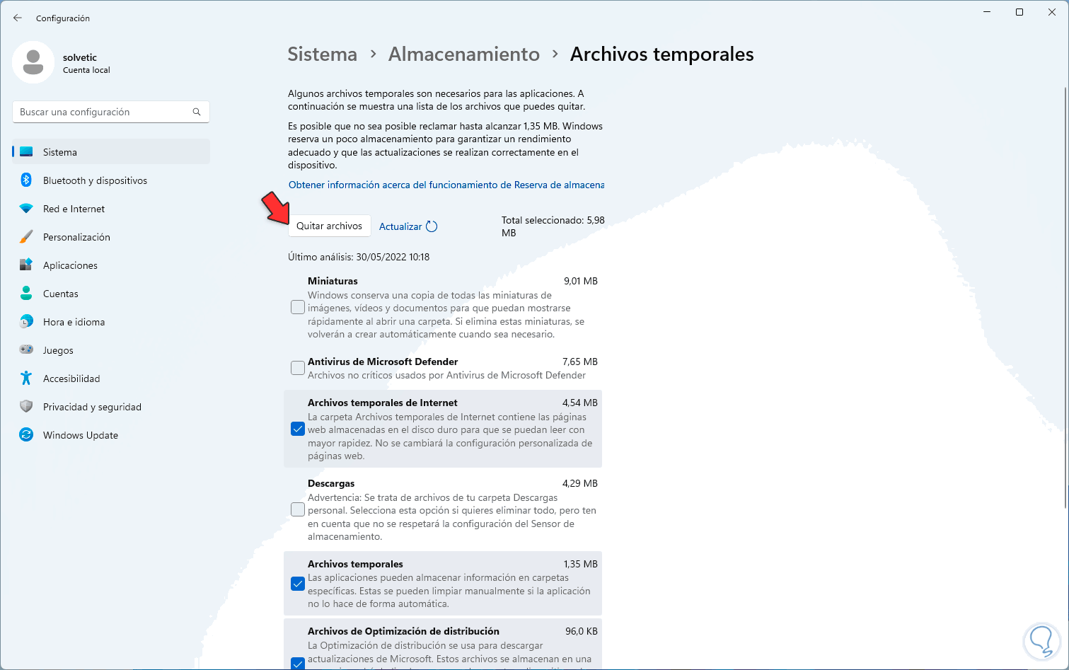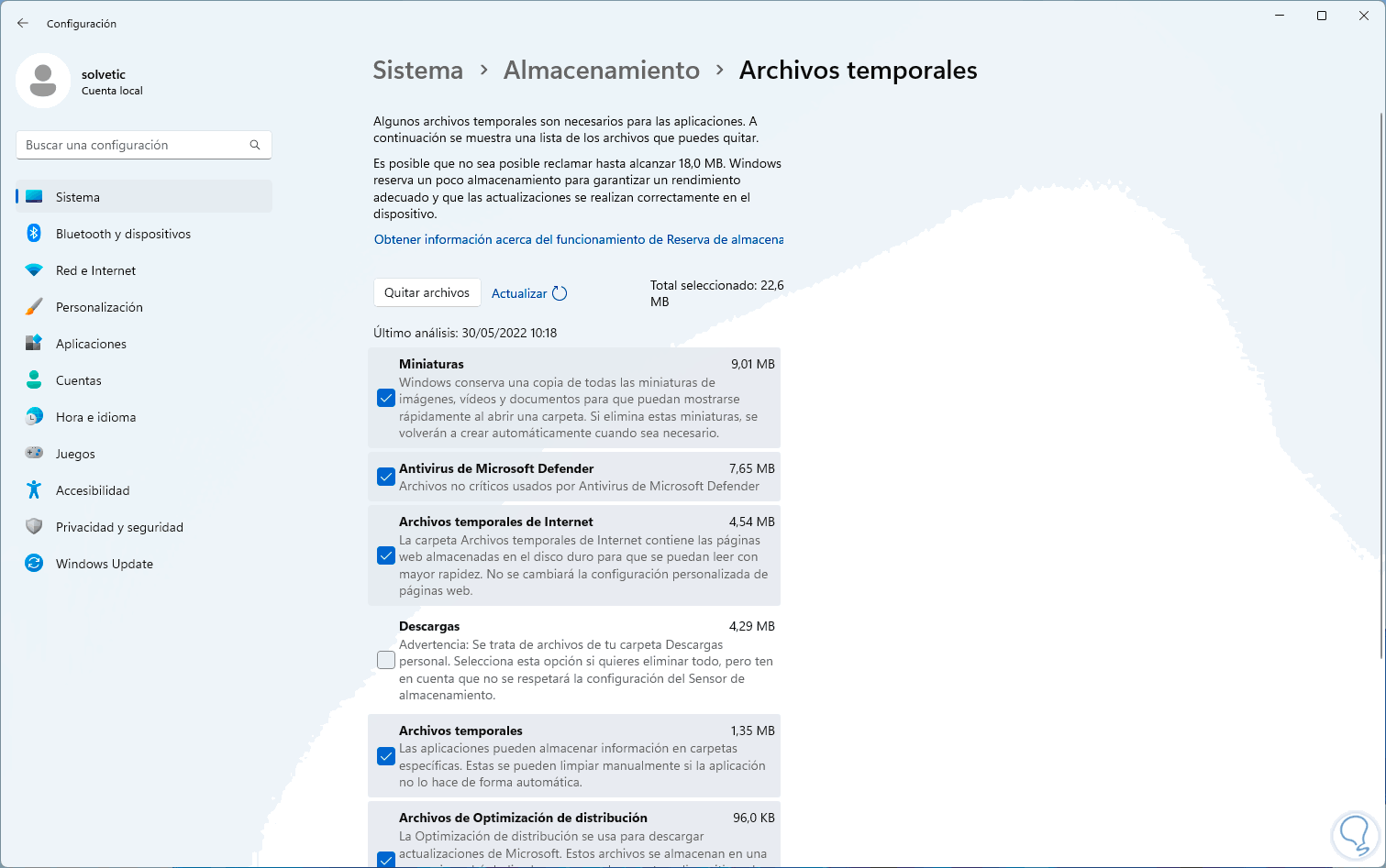 Debemos confirmar que el interruptor “Sensor de almacenamiento” este activo, ahora damos clic en "Archivos temporales" para ver la estructura de esta punto crítico en Windows 11:
