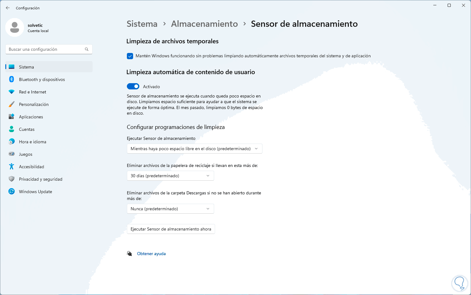 La función del Sensor de almacenamiento se integro desde Windows 11 como una solución para que de forma automática se borren archivos y elementos en bibliotecas del sistema que si se llegan a acumular pueden causar lentitud del sistema debido a que el disco duro debe exponerse a procesos mas profundos, pero gracias al Sensor de almacenamiento no solo estas bibliotecas sino muchos mas lugares del sistema pueden ser optimizados.