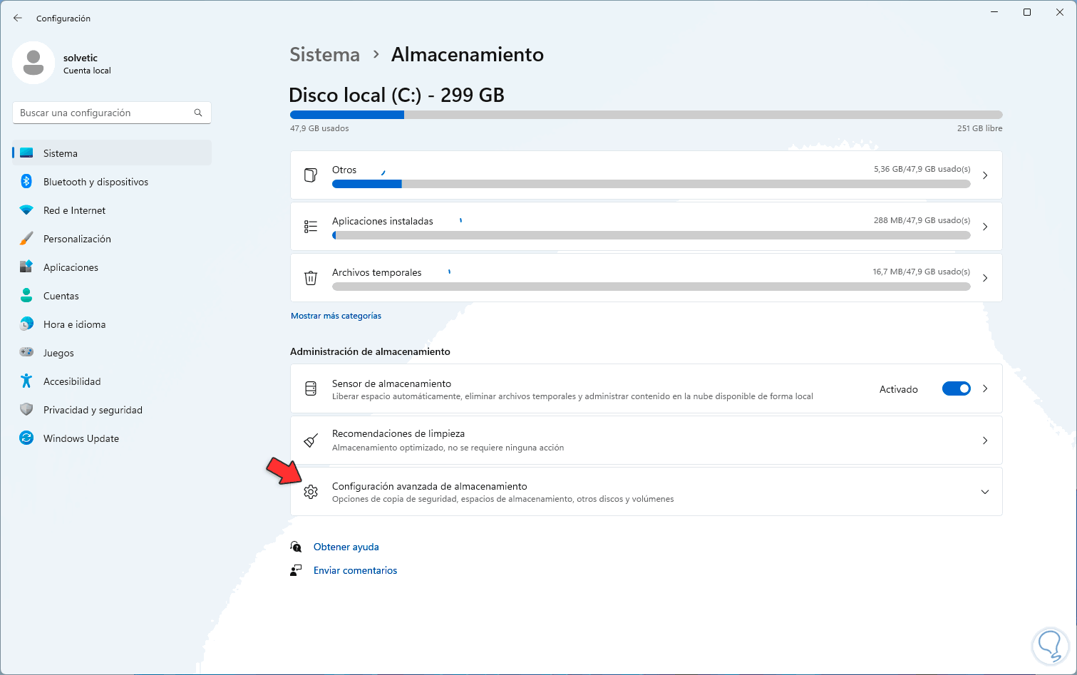 Ahora en Almacenamiento damos clic en "Configuración avanzada de almacenamiento":