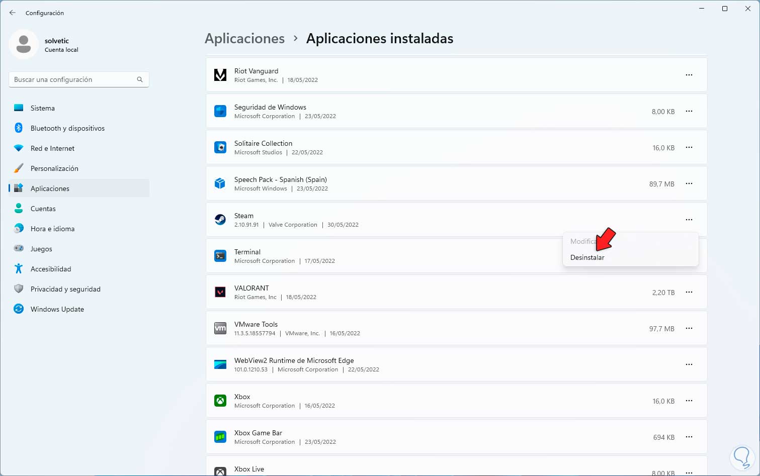 En esta sección encontramos todas las aplicaciones, tanto las preinstaladas como las que se instalan como usuario, del sistema, es posible que alguna app no se use y por lo tanto ocupa un espacio del disco duro, para desinstalarla, pulsamos en el menú contextual de las apps menos usadas y seleccionamos "Desinstalar":