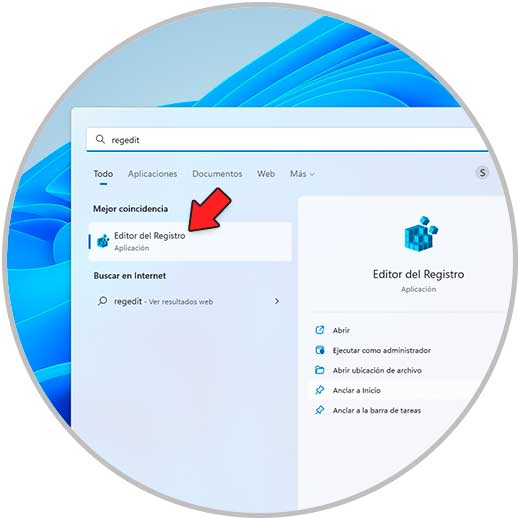 Abrimos el Editor de registros regedit desde el menú Inicio: