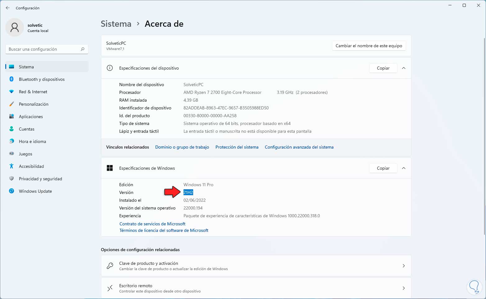 Comprueba la versión de Windows 11 usada la cual es 21H2 en la línea “Versión”: