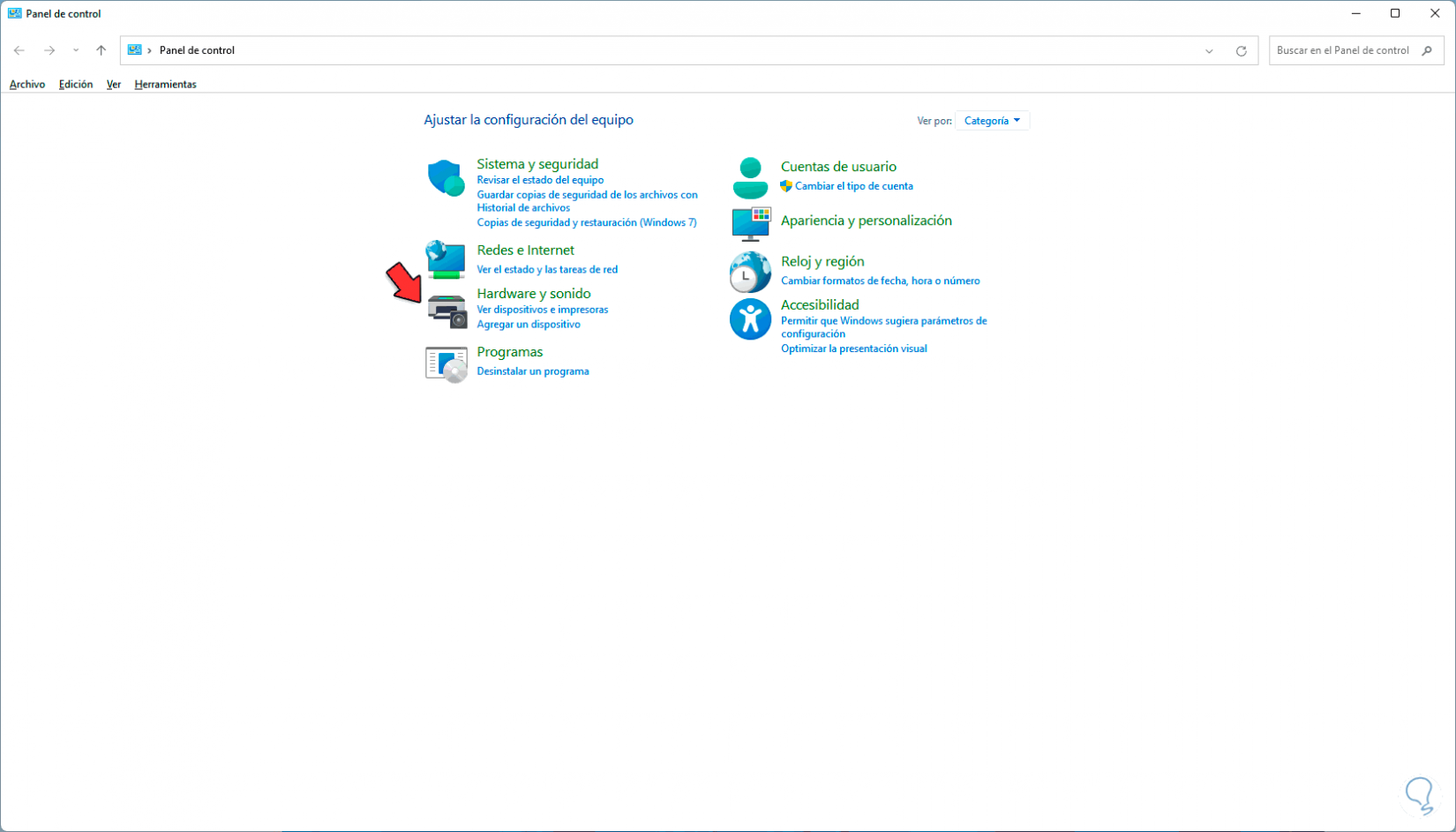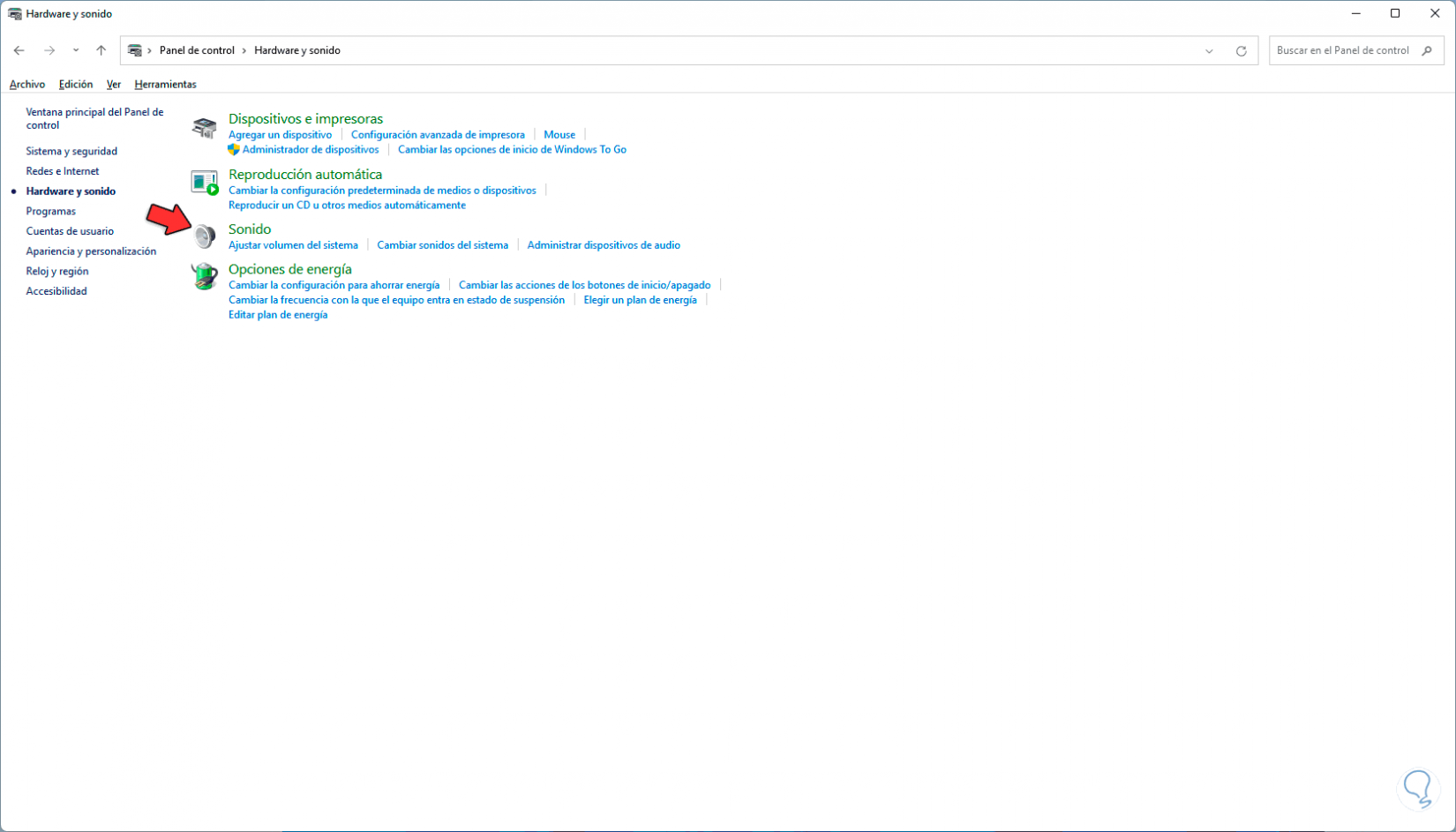 Damos clic en “Hardware y sonido” para ver las siguientes opciones: