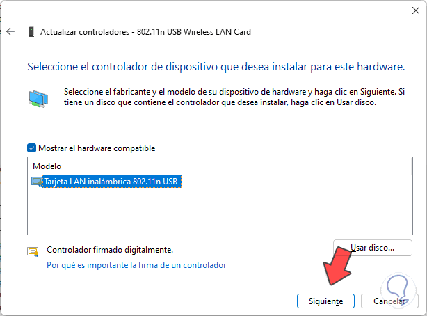 Damos clic en "Elegir en una lista de controladores disponibles en el equipo" y en la siguiente ventana seleccionamos el controlador a usar: