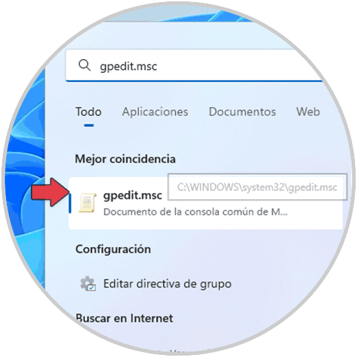 Este método aplica en las ediciones Pro y Enterprise de Windows 11, en el buscador de Inicio ingresamos "gpedit.msc":