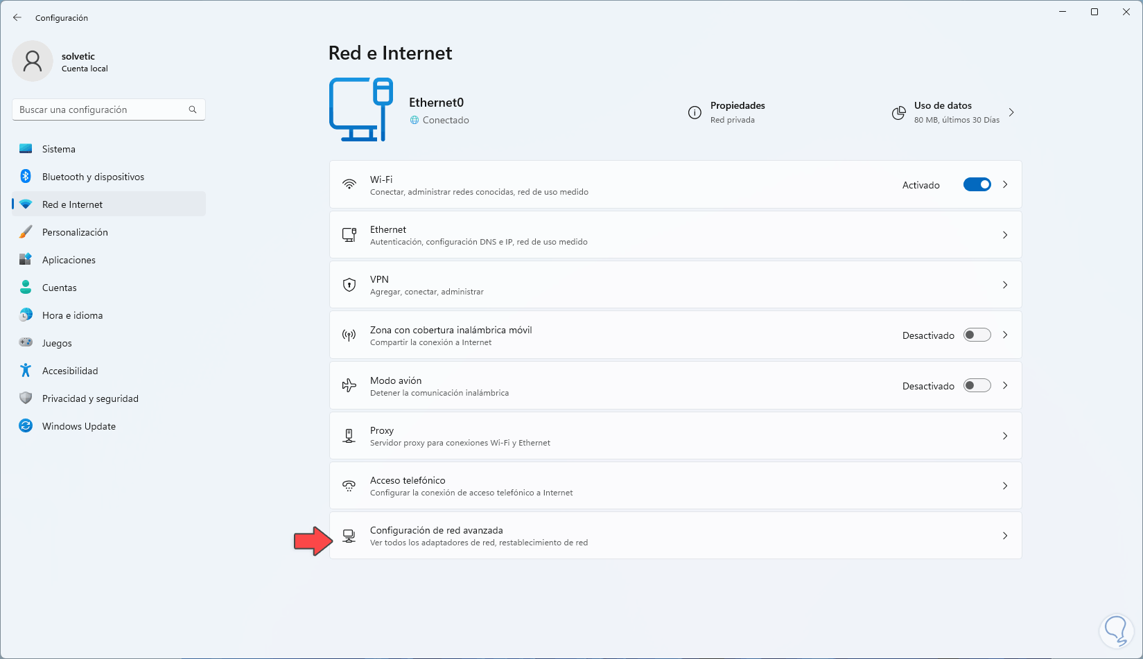 Iremos a “Red e Internet - Configuración de red avanzada”: