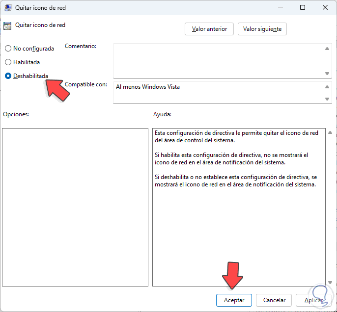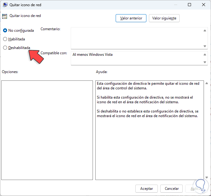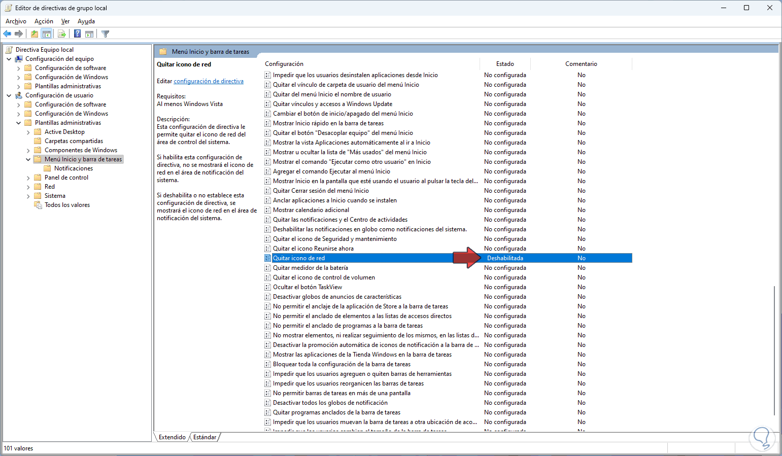 Damos doble clic sobre la política "Quitar icono de red" para ver sus propiedades:
