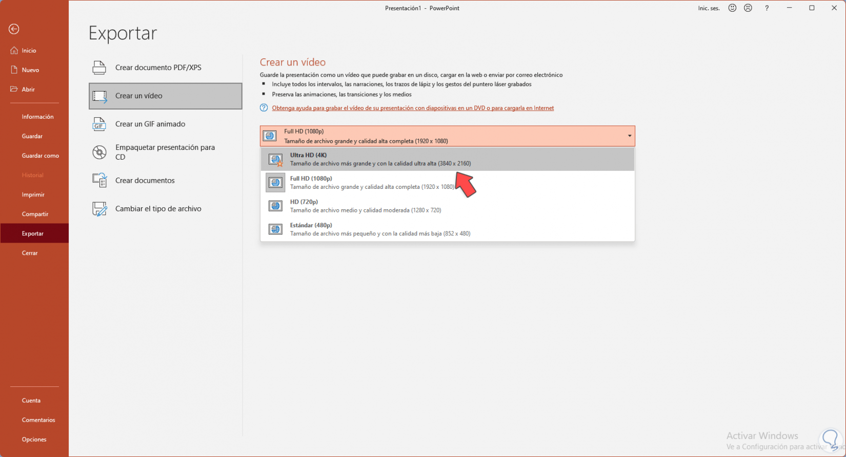 Definimos el formato del vídeo entre las opciones disponibles las cuales incluyen 4K: