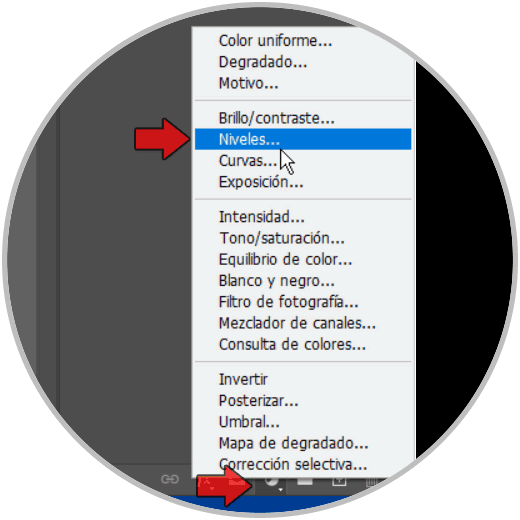 Desde el panel de Capas, vamos a ir al icono de creación de "Crear nueva capa de relleno o ajuste" y primero empezamos con "Niveles"