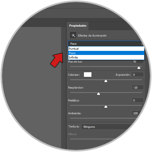 Aquí podremos variar el efecto de iluminación cambiando el tipo de foco así como sus propiedades y así crear una fuente de iluminación manualmente