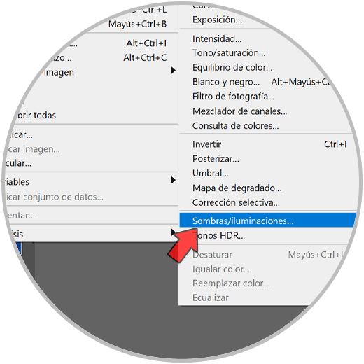 Esta vez vamos a jugar con las sombras y la iluminaciones de la imagen para cambiar su iluminación general. Para ello iremos a “Imagen – Ajustes” y pulsamos sobre “Sombras/Iluminaciones”.