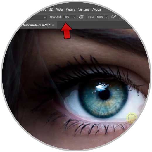 Con la herramienta Pincel y el color que hemos seleccionado y una "Opacidad" del 100% vamos a pintar sobre la zona del ojo a mejorar. Ajusta el tamaño del pincel para ello y ve variando según la parte donde estés pintando.