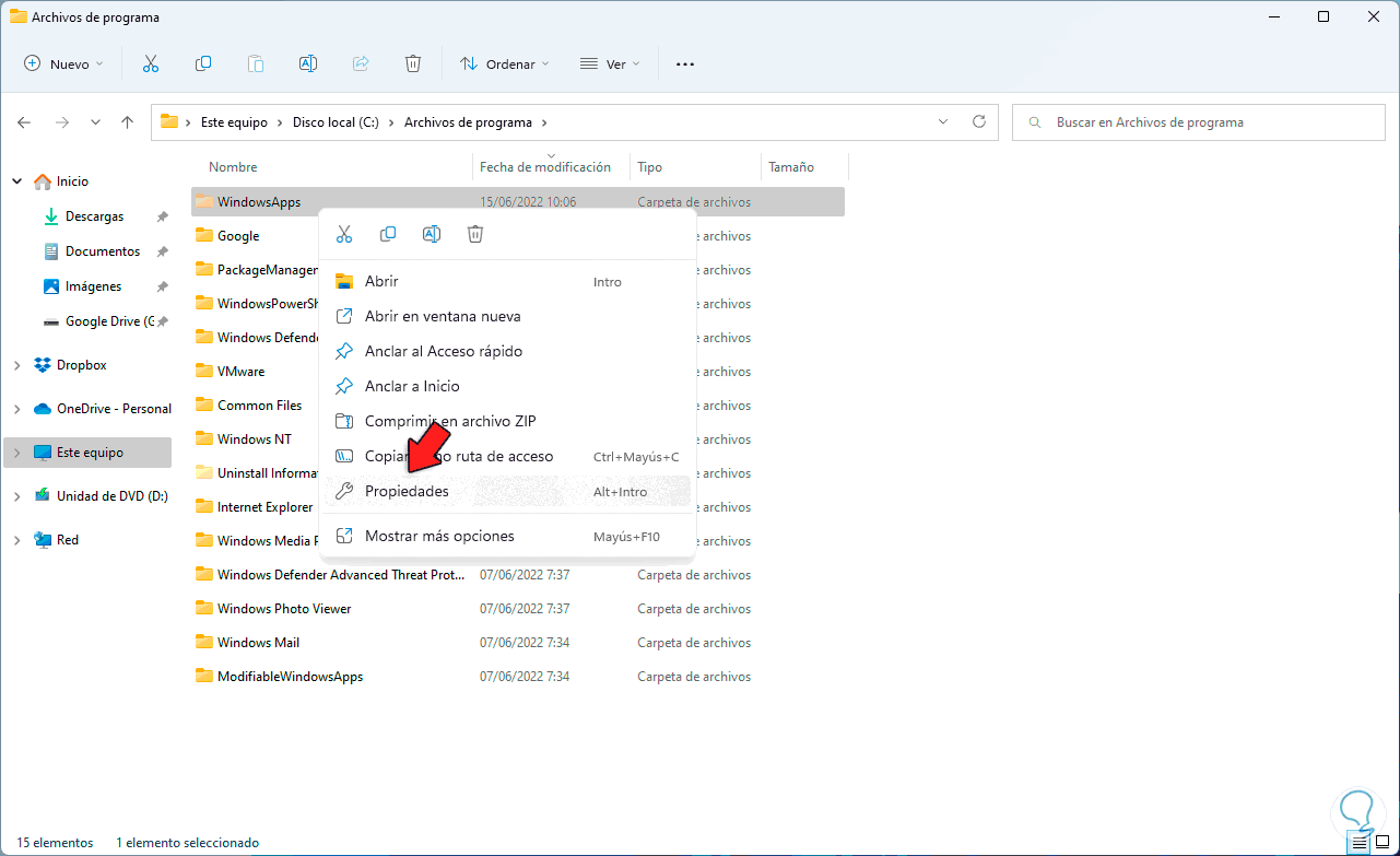 C:\Program Files\WindowsAppsDamos clic derecho sobre la carpeta y seleccionamos la opción "Propiedades":