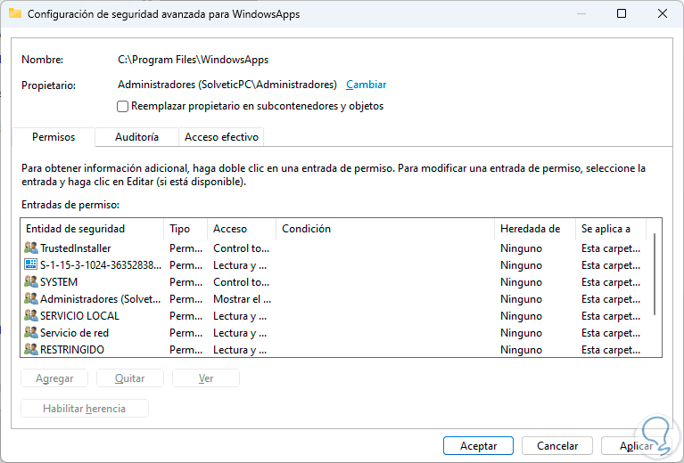 Con este permiso es posible tener acceso a la carpeta WindowsApps y gestionar su contenido recordando lo importante de cada parámetro allí alojado.