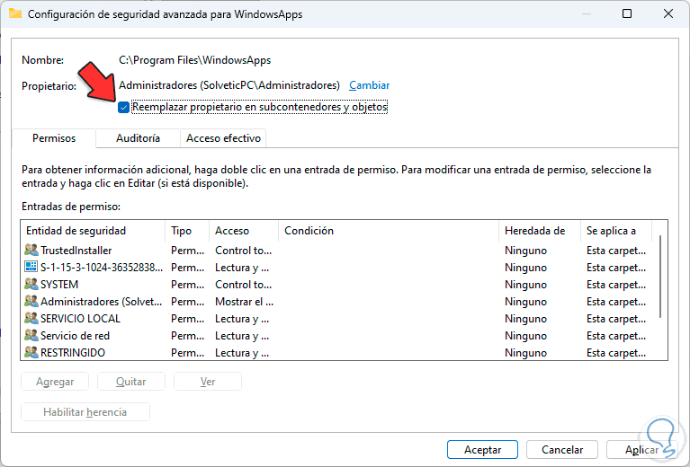 Ahora es momento de que todo el contenido de WindowsApps asuma este nuevo propietario, para ello activamos la casilla "Reemplazar propietario en subcontenedores y objetos":