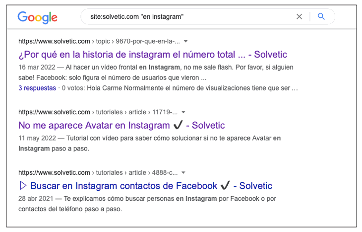 Para ello debes usar site: y escribir dentro de las "" las palabras clave que quieres buscar. Verás que aparecen estos resultados