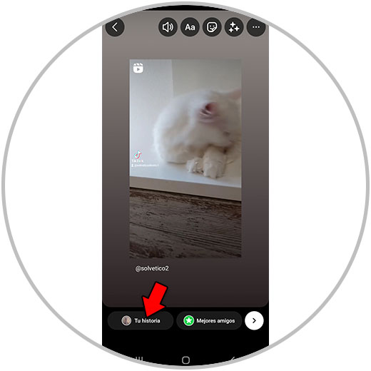 Ahora, entre las opciones disponibles, en la parte superior de la pantalla aparecerán varios efectos que puedes añadir: texto, gifs, música, stickers, etc. Pulsa sobre las opciones para añadirlas si quieres y una vez que hayas terminado selecciona “Tu historia”.