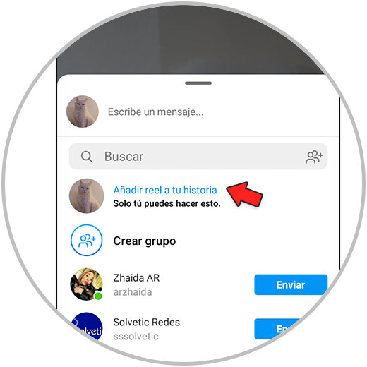 Ahora, tenemos que seleccionar la opción de "Añadir Reel a tu historia". Recuerda que solo tú puedes realizar dicha acción dentro de Instagram