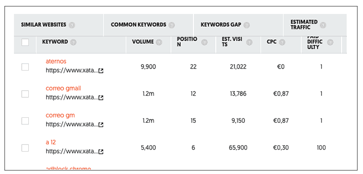 Pero además de esto, ofrece la posibilidad de ver la posición de una URL en base a esa palabra clave que has introducido. Podrás ver las otras URL que hacen competencia a esta Keywords y analizar diferentes aspectos de la competencia.