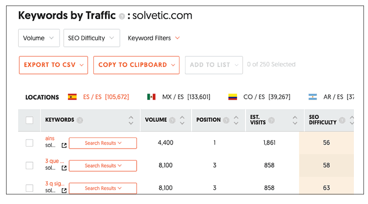 Con esta herramienta puedes analizar los volúmenes de búsqueda de 70 países (entre los que se encuentran España, México, Canadá, Argentina, o Estados Unidos) con diferentes datos en base a las keywords de otras páginas.