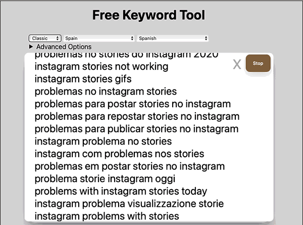 Una vez que hayamos metido nuestra palabra clave en el buscador y hayamos seleccionado el idioma deseado, veremos que aparecen una serie de resultados relacionados con esta Keyword, lo que nos ayudará a crear nuevos contenido, contenido relacionado o ideas para aumentar el contenido ya creado.