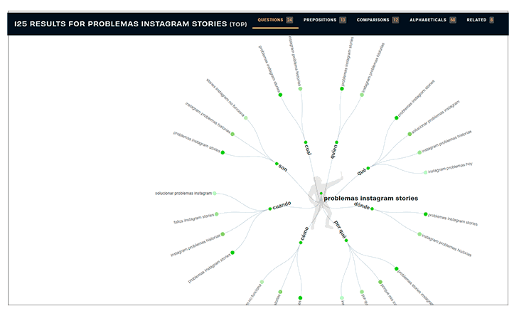 Otra de las opciones que nos ofrece esta herramienta para sacar ideas de manera rápida, es ver por orden alfabético, una serie de palabras clave sugeridas a aquellas que hemos introducido nosotros en su buscador. De este modo podrás ver desde la A a la Z, todas las opciones que han encontrado el programa como contenido similar o sugerido.