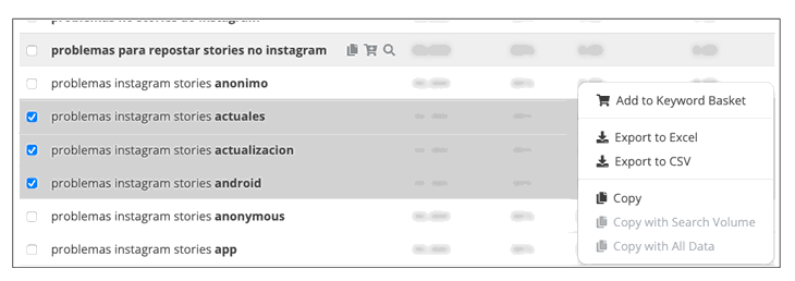 Podemos seleccionar algunas de estas Keywords que nos interesen para crear un archivo y de este modo poder descargarlo en forma de Excel por ejemplo en nuestro ordenador. Para ello las seleccionamos en el lateral y pulsamos en el icono inferior de la página. Desde aquí seleccionamos la opción que necesitemos.