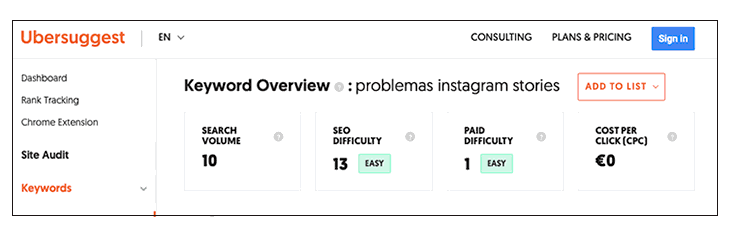 Si seleccionas alguna de estas web, podrás ver las palabras clave para las que posicionan, y conocer de este modo y datos de volumen o dificultad para ver si merece la pena por tanto competir contra ellas.