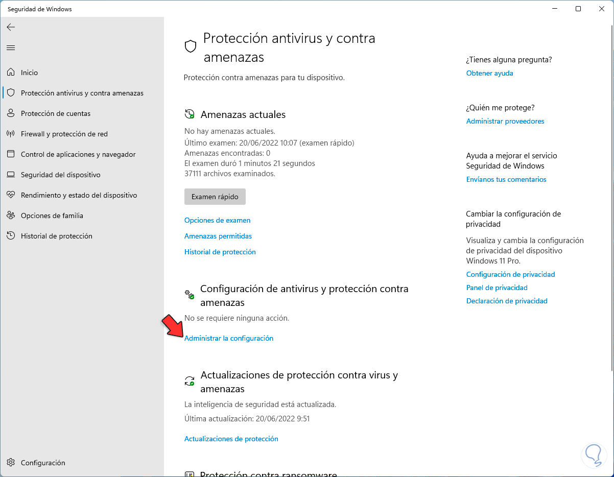 Vamos a "Protección antivirus y contra amenazas" para ver lo siguiente: