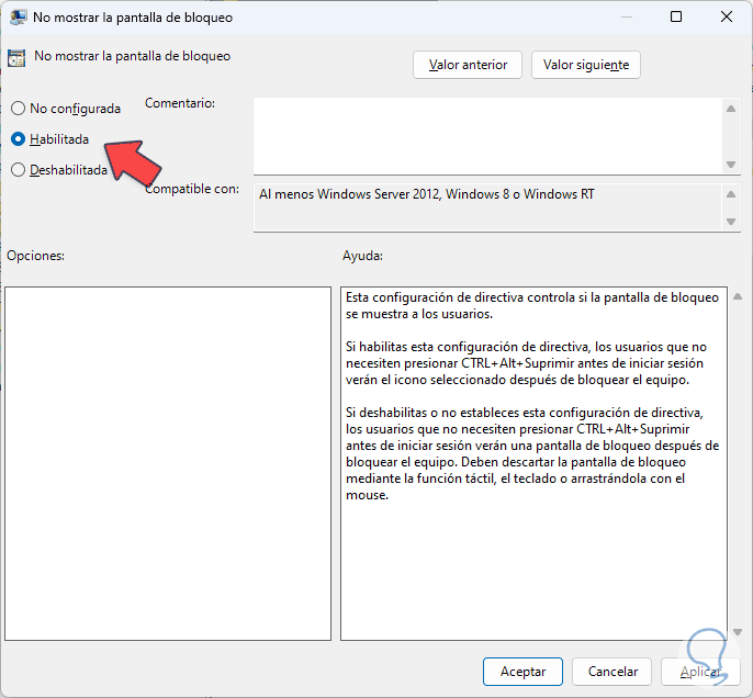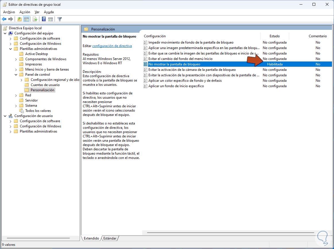Damos doble clic sobre la política "No mostrar la pantalla de bloqueo" para ver sus propiedades: