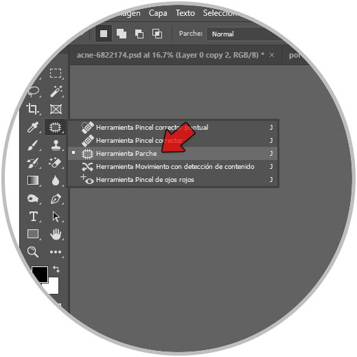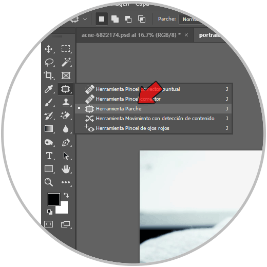 Para quitar una ojera o mancha vamos a usar la herramienta "Parche":