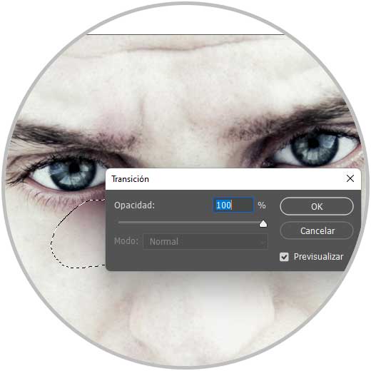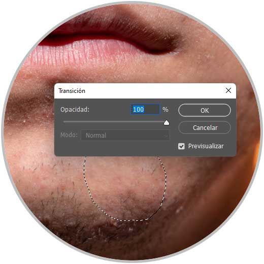 Así vamos haciendo diferentes selecciones para corregir zonas. Una vez hemos usado cualquier de las opciones anteriores podemos modificar la Opacidad de la "Transición" usando esta combinación: